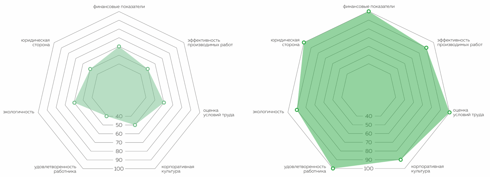 1. Финансовые показатели 2. Эффективность производимых работ 3. Оценка условий труда 4. Корпоративная культура 5. Удовлетворенность работника 6. Экологичность 7. Юридическая стороны (наличие судебных дел)